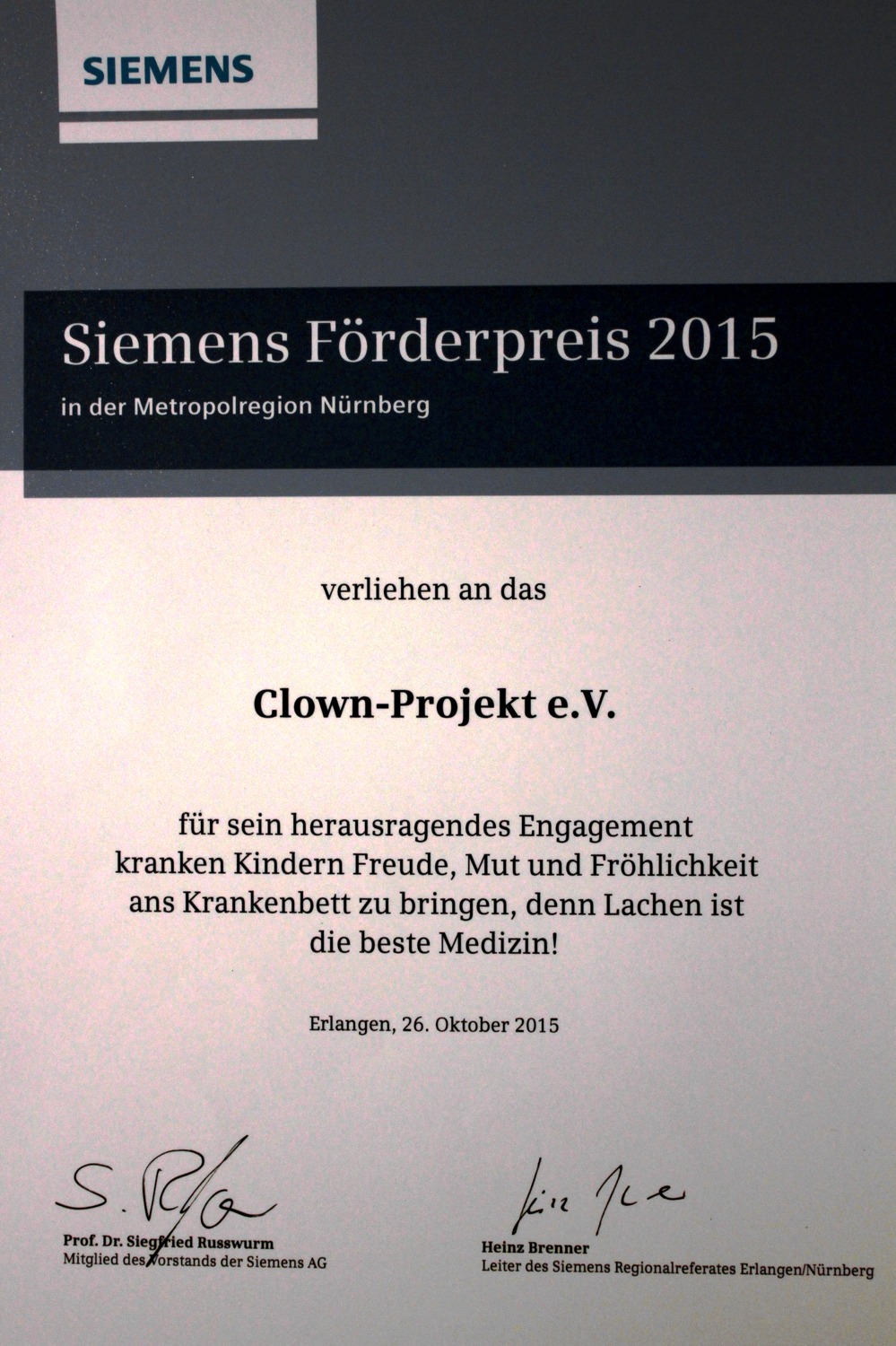 Am 26.10.2015 wurde dem Clownprojekt e.V. der Siemens Förderpreis in der Metropolregion Nürnberg überreicht.